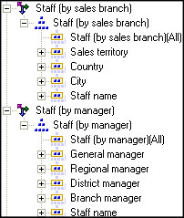 Por ejemplo, Manager o Geography pueden visualizar Sales staff. En las aplicaciones Studio de IBM® Cognos, estas jerarquías son estructuras lógicas independientes pero intercambiables, vinculadas a la misma consulta subyacente.