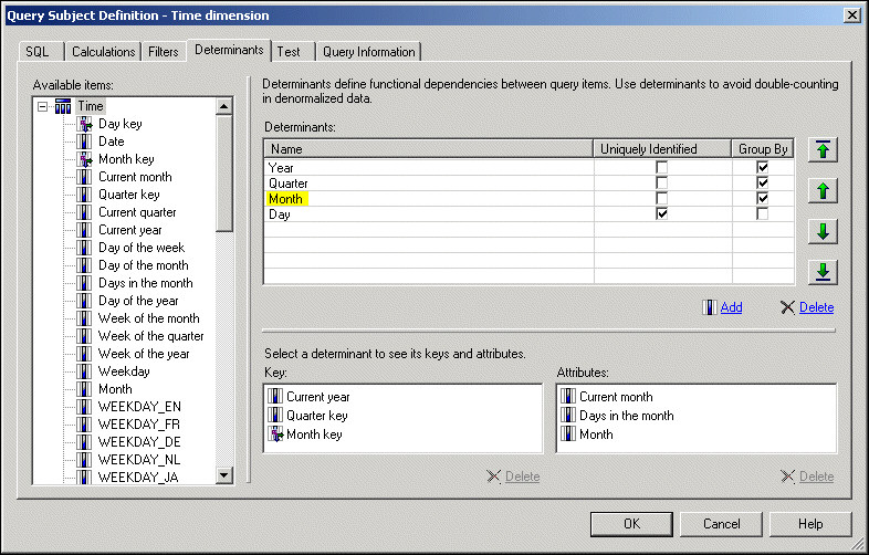 Time es el punto central del aspecto relativo a la granularidad en este ejemplo. Sales está unido a la dimensión Time de la clave Day y Product forecast está unido a la dimensión Time de la clave Month. Debido a las diferentes claves de unión, se debe identificar de forma clara un mínimo de dos determinantes en la dimensión Time. Por ejemplo, los determinantes para Month y Day tienen identificadas sus claves. Day es la clave única de Time, y las claves Month se repiten para cada día del mes.